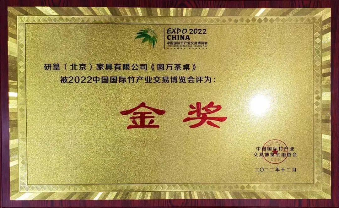 本次参会,竹博会还设置有展品评奖环节,研篁选送“圆方”茶桌参评,该产品功能多维融合,可兼顾多种应用场景,更是因材施艺地将竹材不同性状多样化组合,将传统榫卯结构与现代五金可拆组的结合,使产品既结构稳定又便于运输,其产品体现的创新力深得评委认可,一举夺得本次竹博会参展产品金奖。